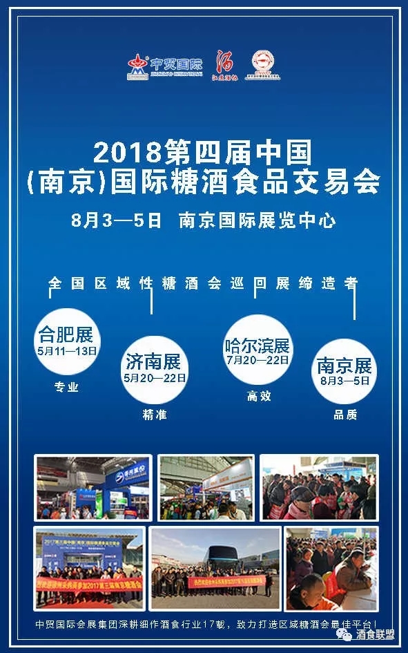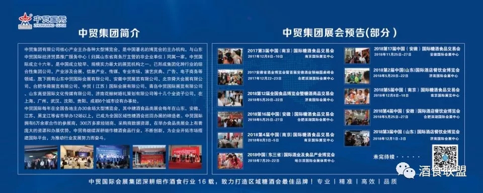 中貿(mào)集團(tuán)2018年計劃將在山東濟(jì)南、安徽合肥、江蘇南京、黑龍江哈爾濱、浙江杭州等省市舉辦十余場次酒博會、食品展、餐飲展,形成聯(lián)動招商、資源互動和共享。
