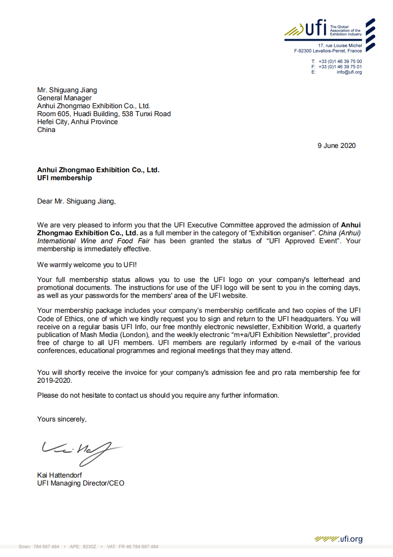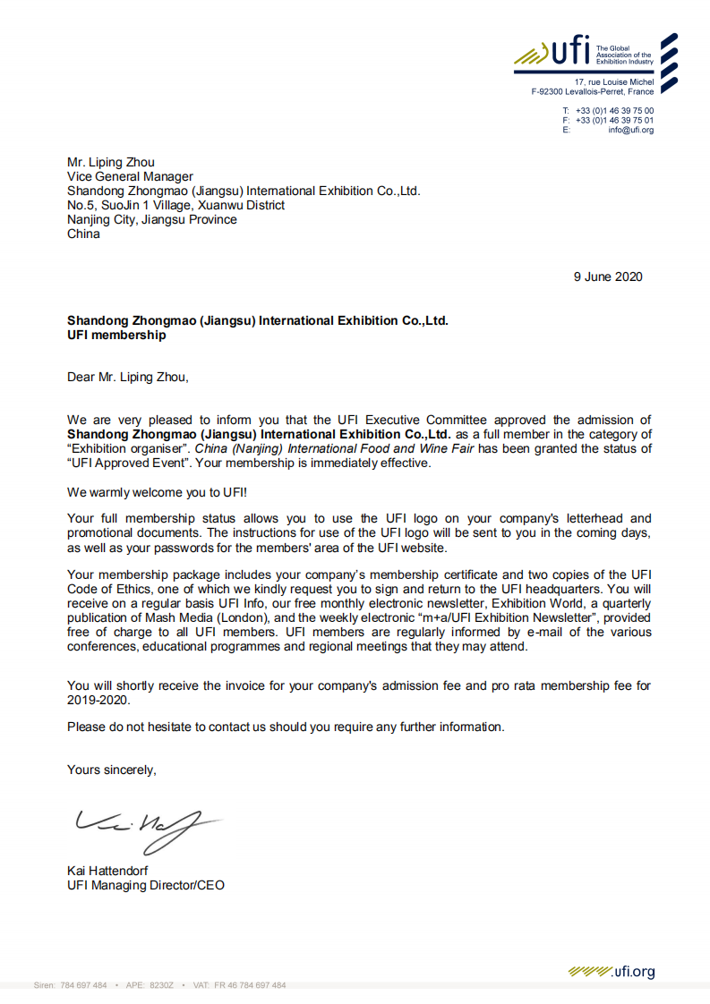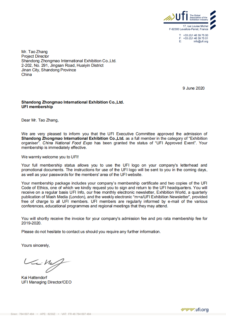 2020年6月9日,UFI(全球展覽業(yè)協(xié)會(huì))巴黎總部傳來(lái)喜訊:中法合資高博中貿(mào)會(huì)展在山東、江蘇、安徽主辦的CNFE全國(guó)食品博覽會(huì)(濟(jì)南)、CNWFF中國(guó)(南京)國(guó)際糖酒食品交易會(huì)、CAWFF中國(guó)(安徽)國(guó)際糖酒食品交易會(huì)三展同時(shí)通過(guò)UFI(全球展覽業(yè)協(xié)會(huì))認(rèn)證,同時(shí)高博中貿(mào)會(huì)展在山東、江蘇、安徽三個(gè)子公司也通過(guò)UFI評(píng)審委員會(huì)的表決,分別正式成為UFI(全球展覽業(yè)協(xié)會(huì))會(huì)員單位。通過(guò)UFI認(rèn)證,是國(guó)際會(huì)展行業(yè)對(duì)主、承辦單位組織辦展能力的肯定,對(duì)展會(huì)在國(guó)際化、專業(yè)化、品牌化運(yùn)營(yíng)方面的充分認(rèn)可。借助UFI認(rèn)證展會(huì)的權(quán)威和影響,努力提升展會(huì)平臺(tái)新高度,助推會(huì)展經(jīng)濟(jì)的快速發(fā)展。